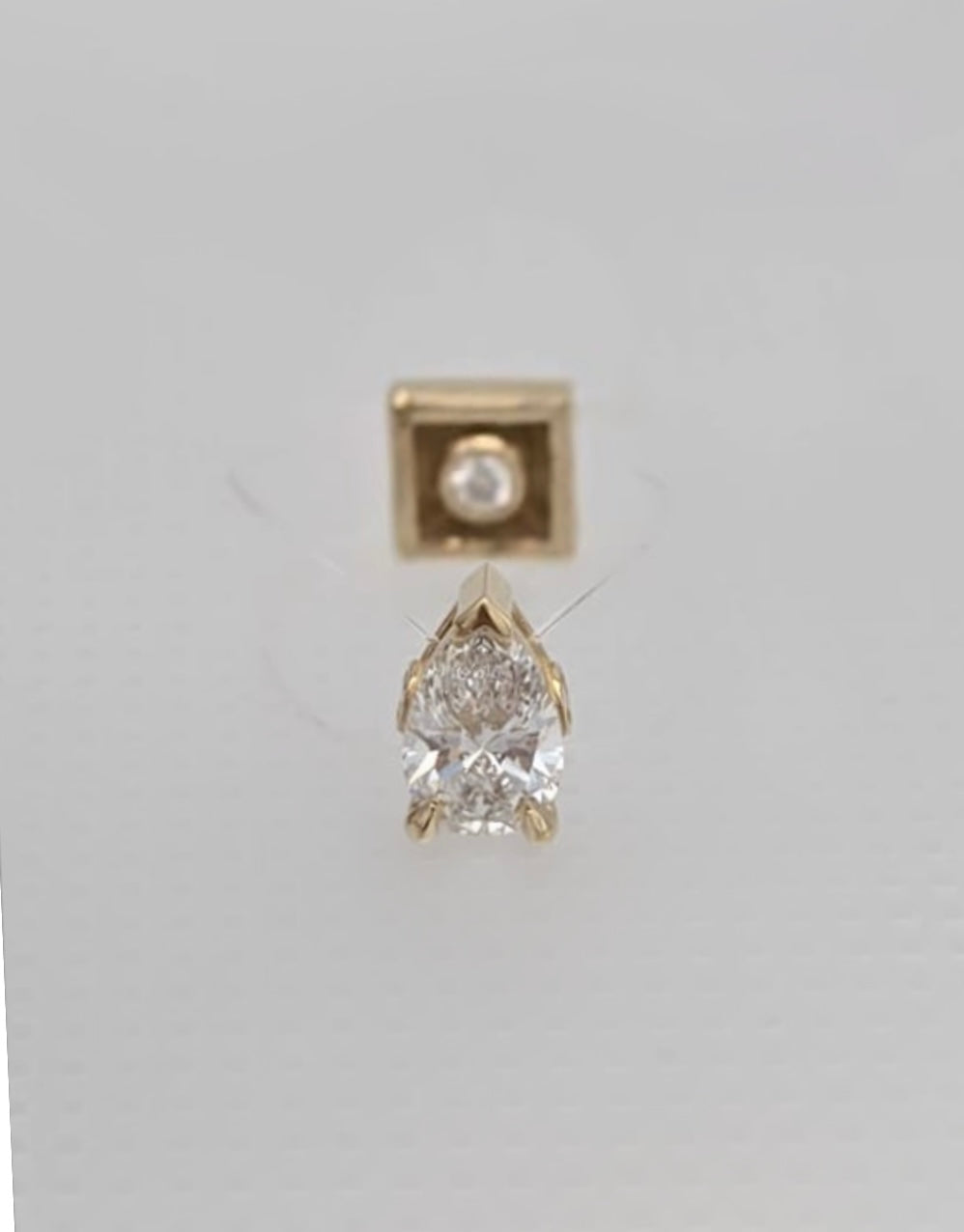 Your design features a 1ct central diamond, two delicate diamond accents, and a hidden diamond inside the 18kt gold backplate—totaling 1.1ct of radiant beauty. Choose from round, marquise, emerald, pear, or heart cuts to make it uniquely yours.